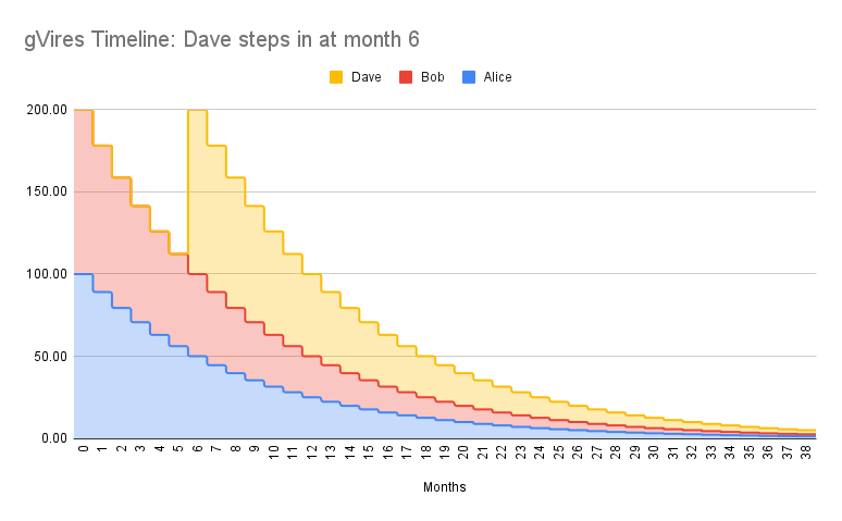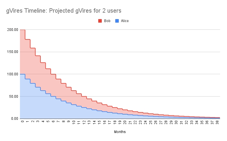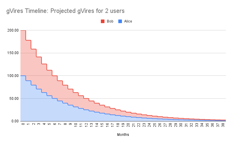 Alice accounts for 50 gVires, Bob accounts for 50 gVires(of now total 100), so they still split the revenue stream 50-50%,