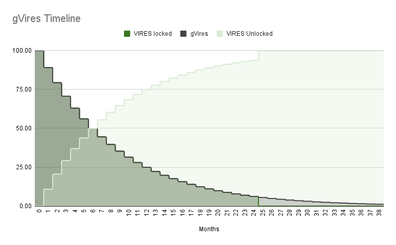 In half a year, the users’s amount of gVires gets halved; also, half of VIRES is free to be withdrawn,